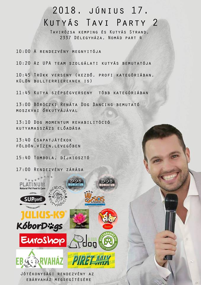 Június 17-én 10:00 – 18:00 között megrendezésre kerül Kutyás Tavi Party 2, a Tavirózsa Kemping (2337. Délegyháza, Nomád part 4.) területén. A sok remek program között szerepel kutyás bemutató, csapatjátékok földön-vízen, terápiás kutyamasszázs, valamint tombola, melynek bevételének egy részét az Eb Árvaház kutyusainak ajánlják fel. Egész nap kutya-gazdi fotózás mellett tanácsadási, vásárlási lehetőségeket is biztosítanak a rendezvény támogatói. A nap házigazdája Müller Attila lesz.