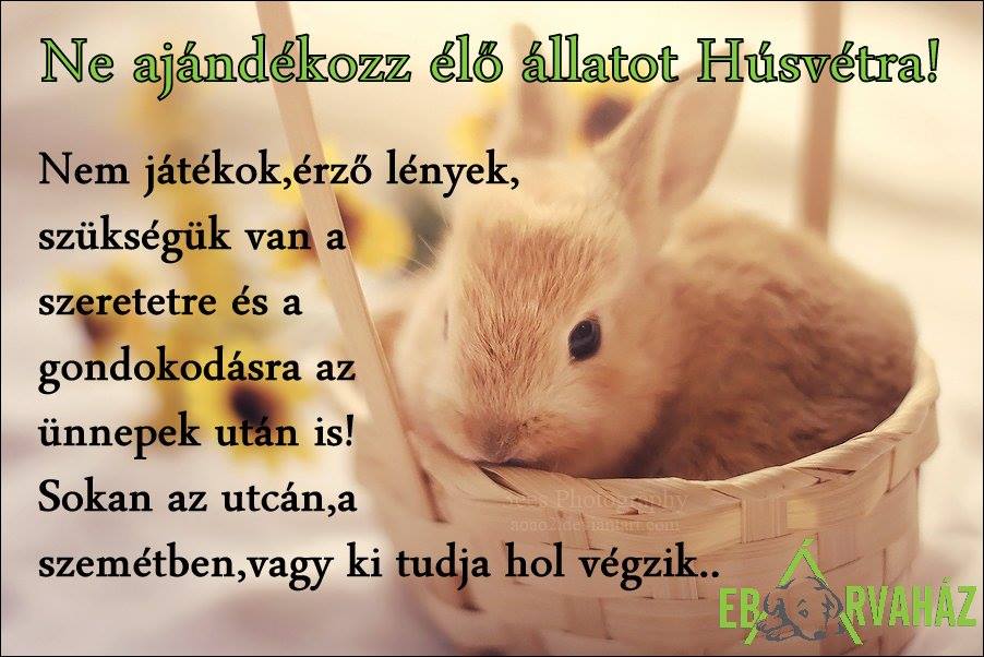 DetailsAz állatok iránt felelősséggel tartozunk azután is, ha már a gyermek „megunta”. Kérünk minden állatbarátot, hogy ne ajándékozzon élő állatot Húsvétra! Minden kedves családot várunk szeretettel egy kellemes sétára az Eb Árvaházba a húsvéti ünnepek alatt is! Gyere és sétáltass meg gyermekeiddel néhány kedves kutyust! Boldog, Áldott Húsvétot kívánunk minden kedves barátunknak! Címünk: 2461 Tárnok Lukács…